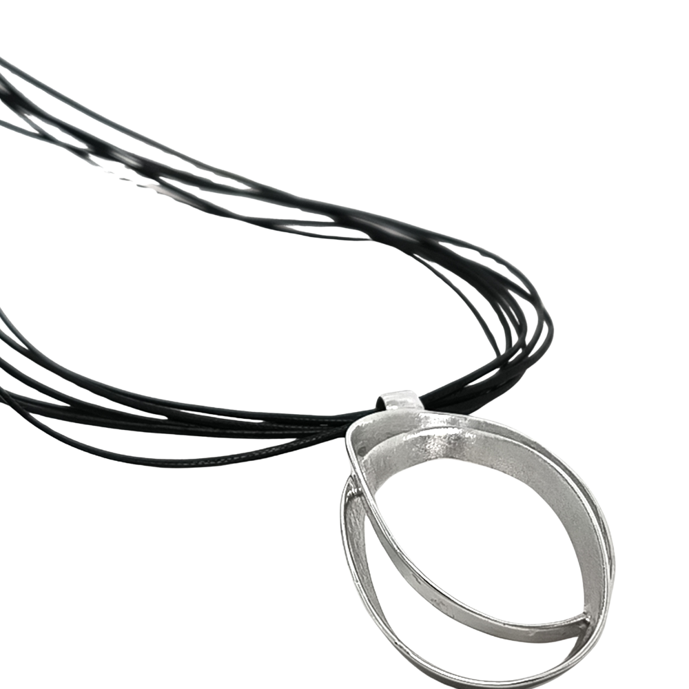Collar colgante hecho a mano en plata con baño de rodio de la colección Ondas con collar multihilo de algodón tratado de 70 centímetros de largo. La pieza del colgante juega con la terminación satinada y brillo. Te hará resaltar tu belleza